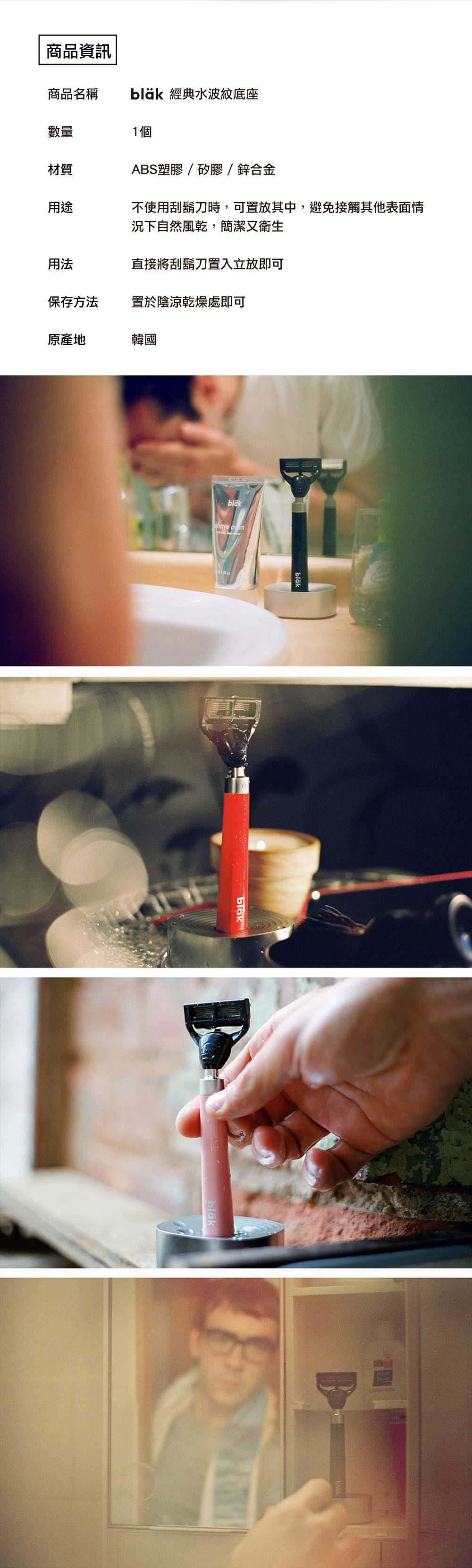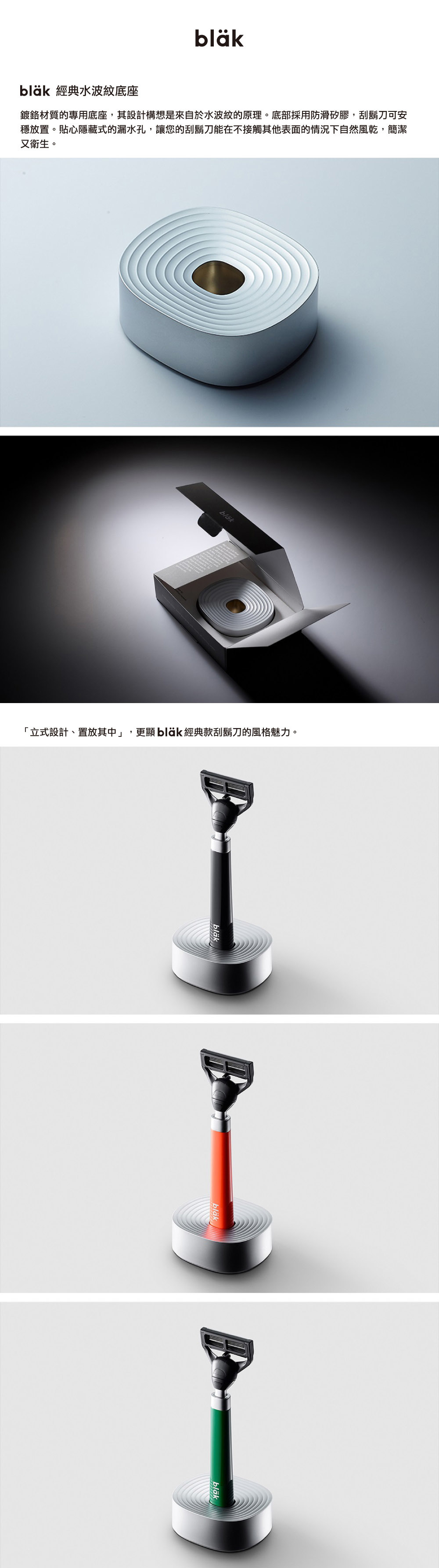 鍍鉻材質的blak刮鬍刀專用底座,其設計構想是來自於水波紋的原理。底部採用防滑矽膠,刮鬍刀可安穩放置。貼心隱藏式的漏水孔,讓您的刮鬍刀能在不接觸其他表面的情況下自然風乾,簡潔又衛生。