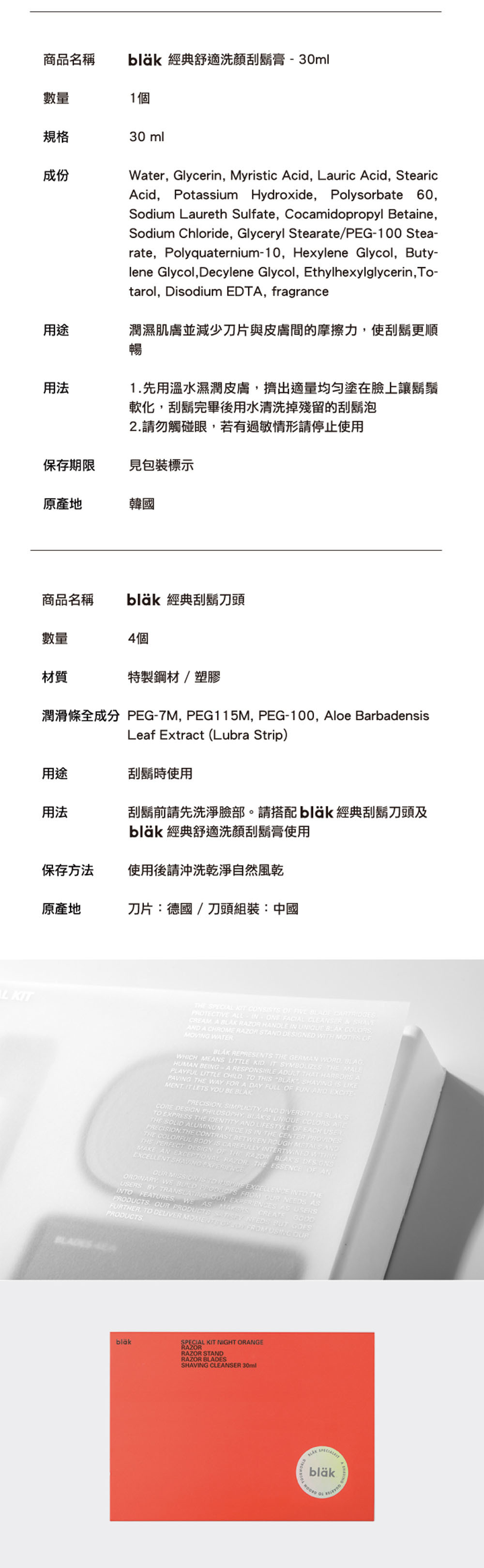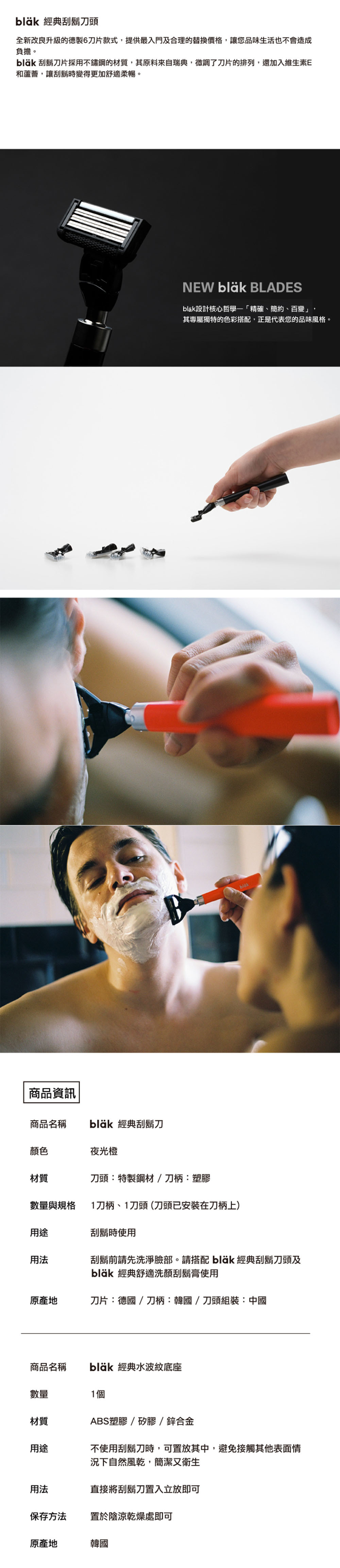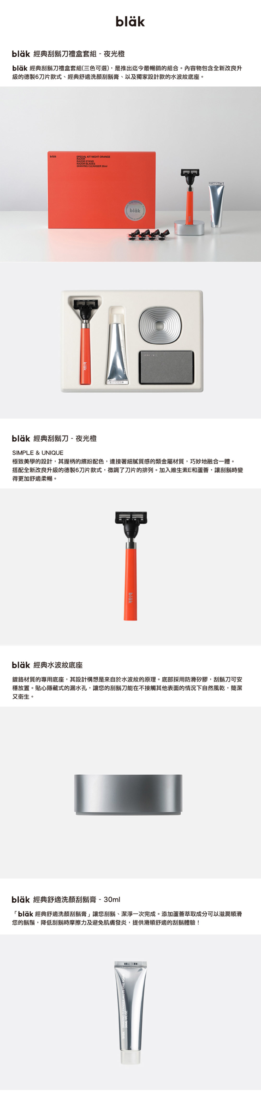 blak經典刮鬍刀禮盒套組(三色可選),是推出迄今最暢銷的組合。內容物包含全新改良升級的德製6刀片款式、經典舒適洗顏刮鬍膏、以及獨家設計款的水波紋底座。
