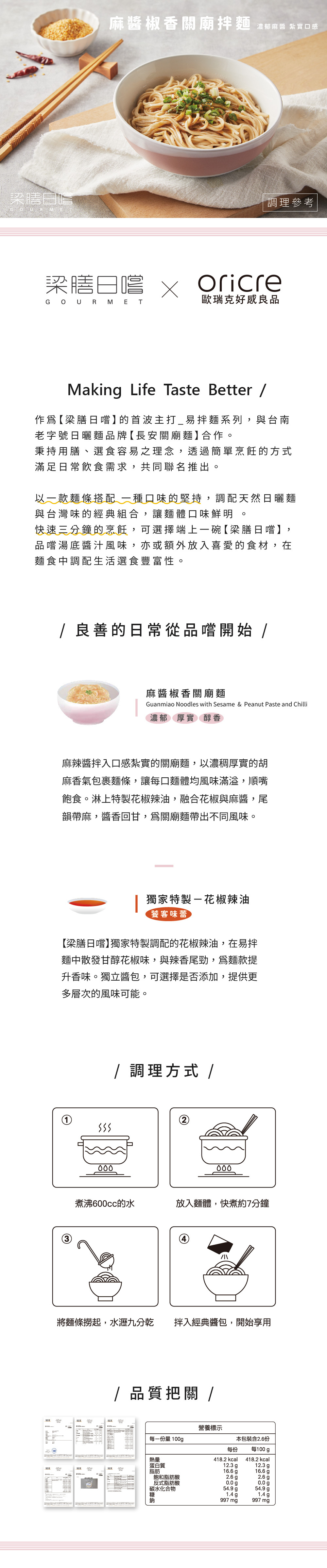 淋上特製花椒辣油,融合花椒與麻醬,尾韻帶麻,醬香回甘,為關廟麵帶出不同風味。