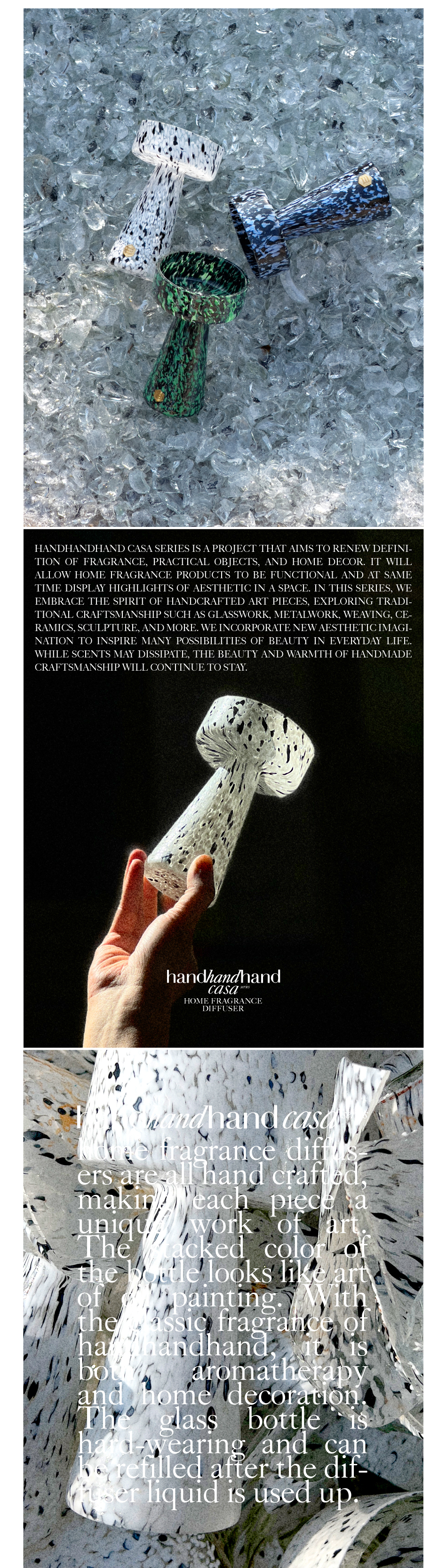 在這個系列,handhandhand投入更多的手作精神去探索、去創作。擅用那些早已存在我們生活中的民間匠人技藝,如玻璃工藝、金工工藝、編織工藝、陶土工藝、雕塑工藝等,融入更多新的美學想像,去啟發生活中各種美好可能。