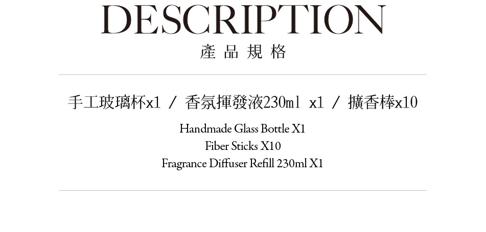 ■ 內容:香氛揮發液230ml、擴香藤條10支、手工吹製玻璃杯1個