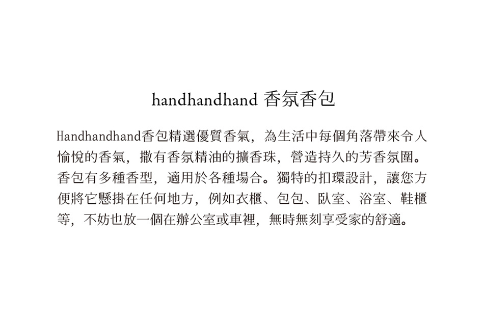同樣具備多種香型,適用於各種場合。獨特的扣環設計,讓您方便將它懸掛在任何地方,例如衣櫃、包包、臥室、浴室、鞋櫃等,不妨也放一個在辦公室或車裡,無時無刻享受家的舒適。