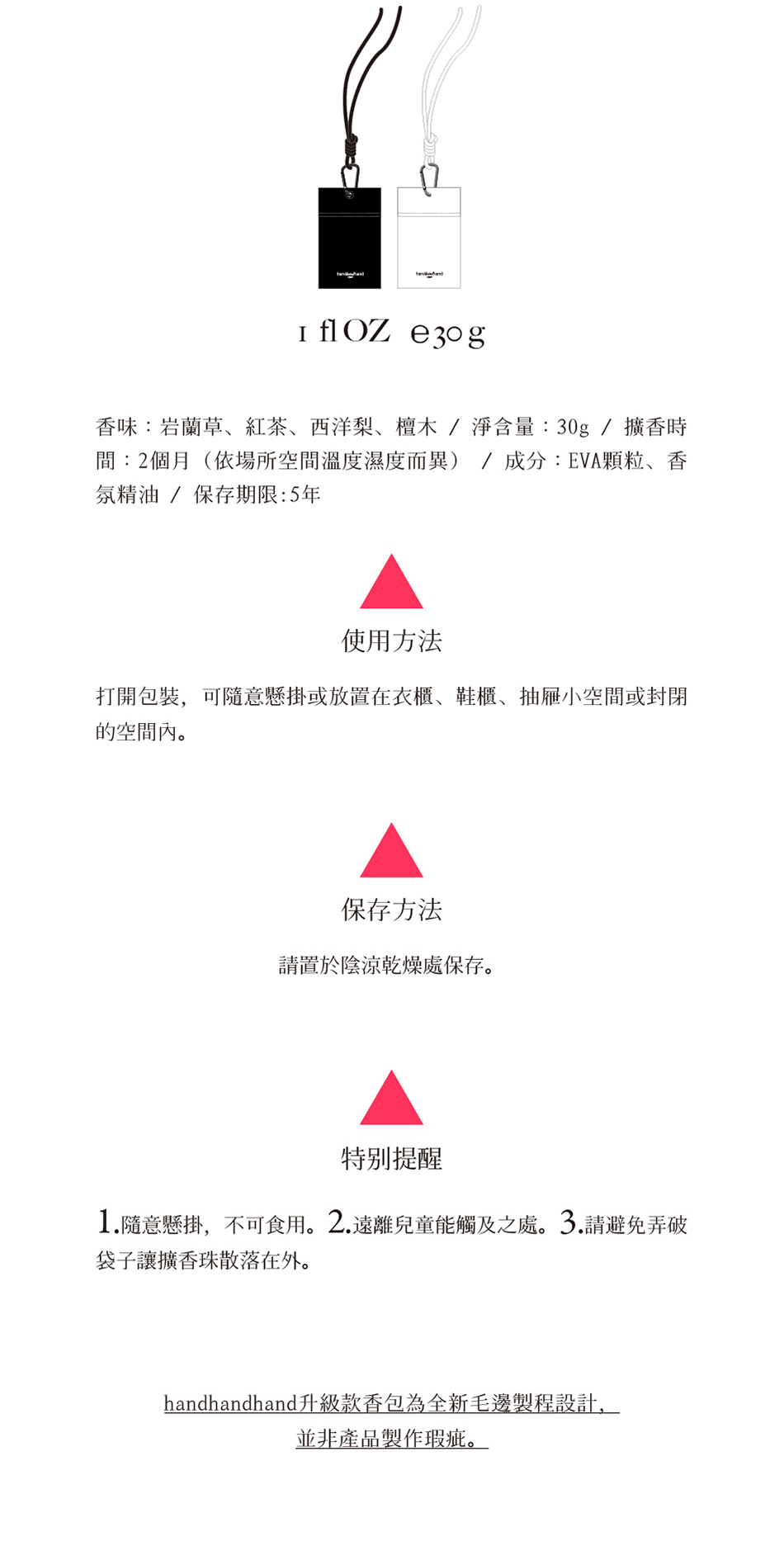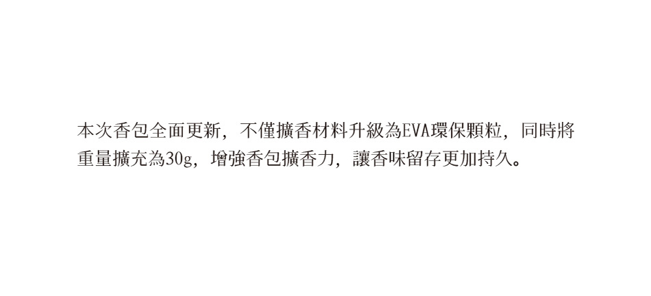 單入款香包全面升級,不僅擴香材料更新為EVA環保顆粒,同時將重量擴充為30g,增強香包擴香力,讓香味留存更加持久。
