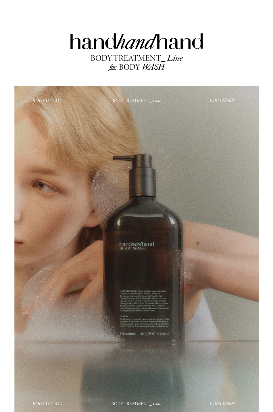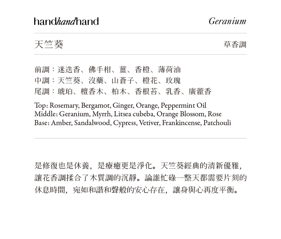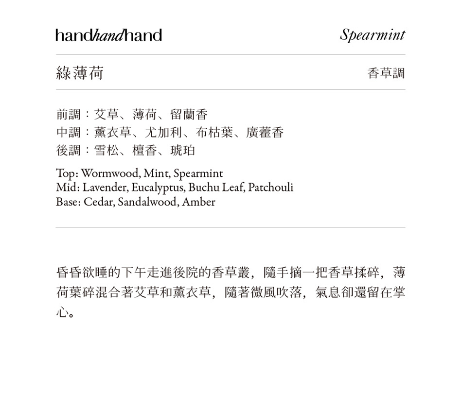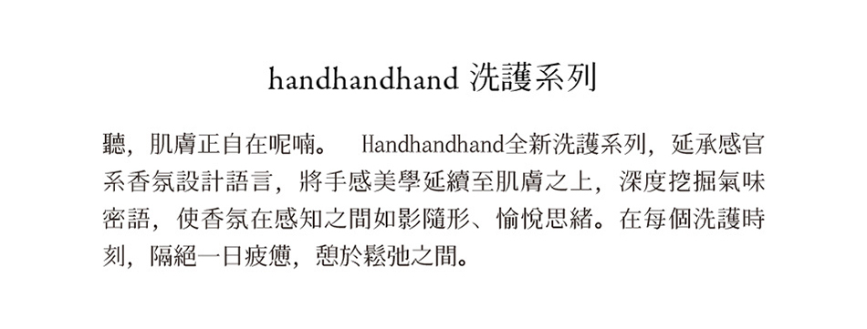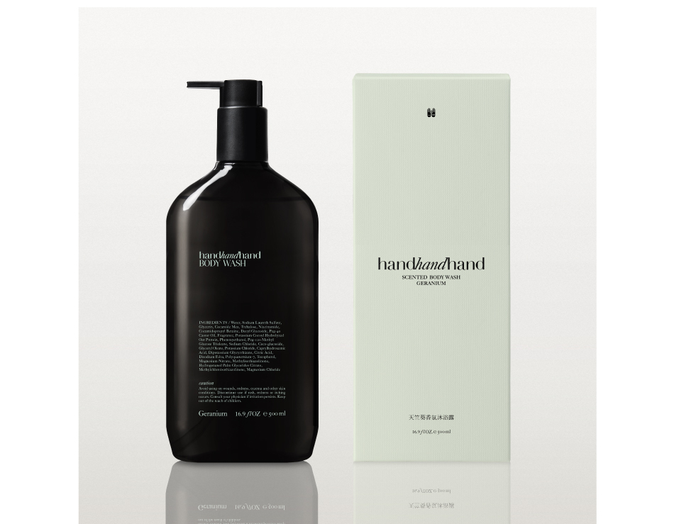handhandhand全新推出香氛沐浴露,精選綠薄荷和天竺葵兩大優質植物香型。精選自然植物萃取物,科學配比,將植物治癒香融入日常清潔,在清透毛孔、舒潤沐浴的同時,用輕盈綿密泡沫,給全身肌膚最高香氣禮遇。