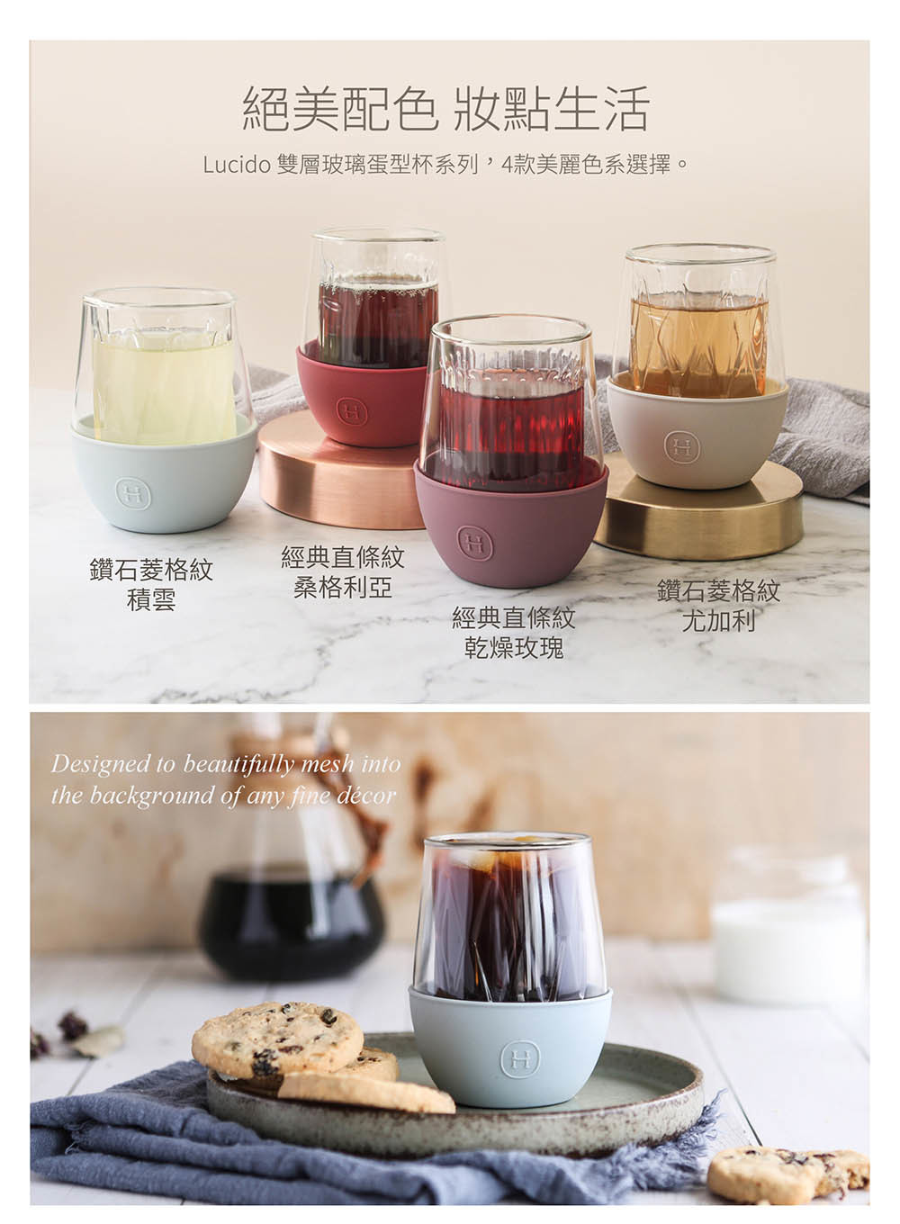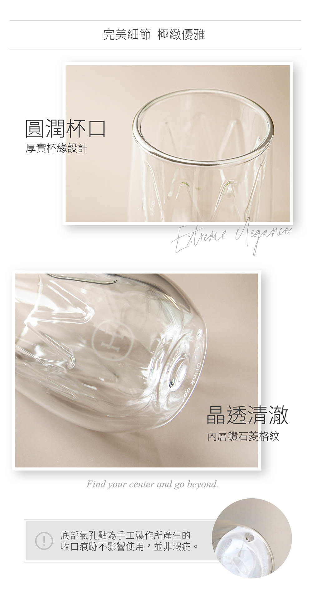 「雙層玻璃設計」冷飲不冒水珠、熱飲不燙手,滿足您的多樣使用需求。