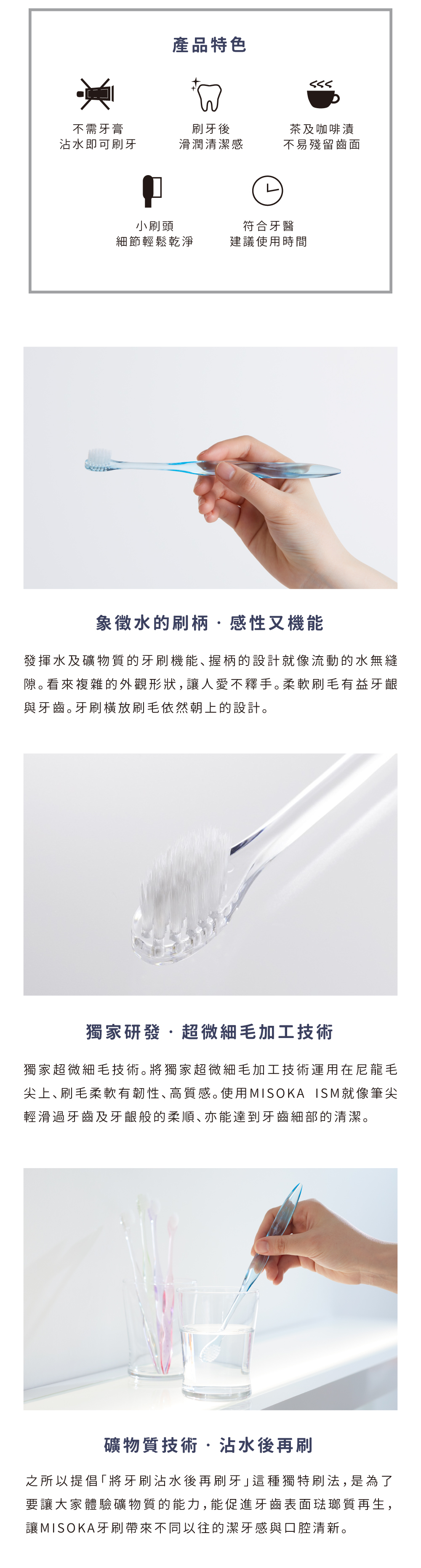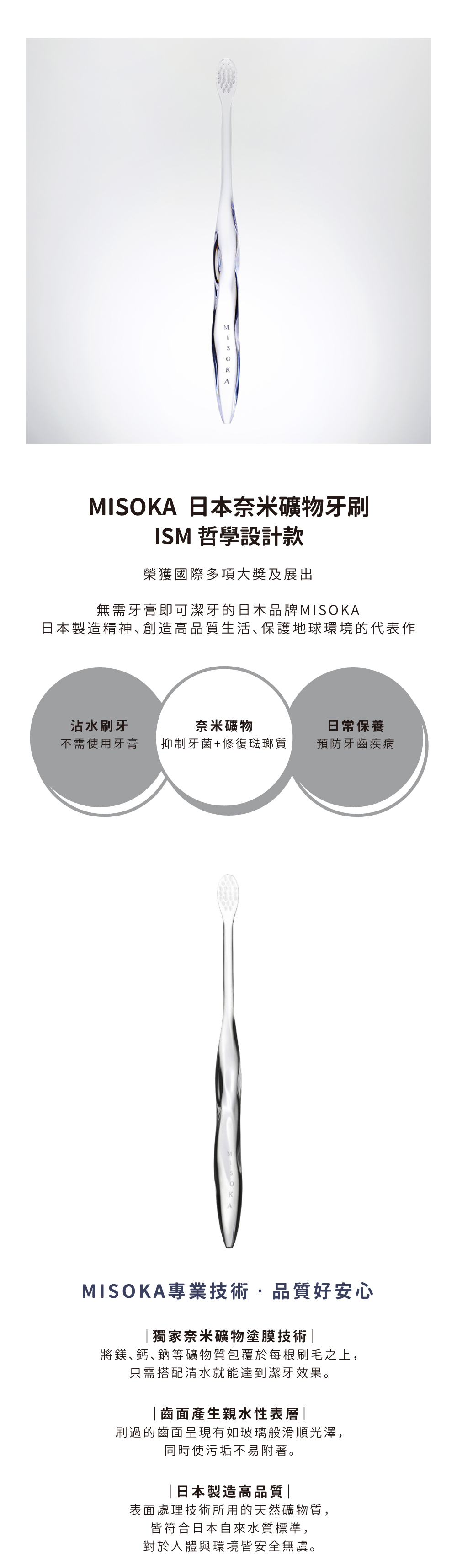 來自日本的 MISOKA,擁有獨家奈米礦物塗膜技術,將礦物質包覆於刷毛之上,只需搭配清水就能達到潔牙效果。這項表面處理技術所用的天然礦物質,皆符合日本自來水質標準,對於人體與環境皆安全無虞。也正因為搭配清水即可刷牙,在日常應用中比一般牙刷更加廣泛且彈性,上市至今已在日本及亞洲各國銷售超過 450 萬支,是打造劃時代頂級牙刷的領導品牌。