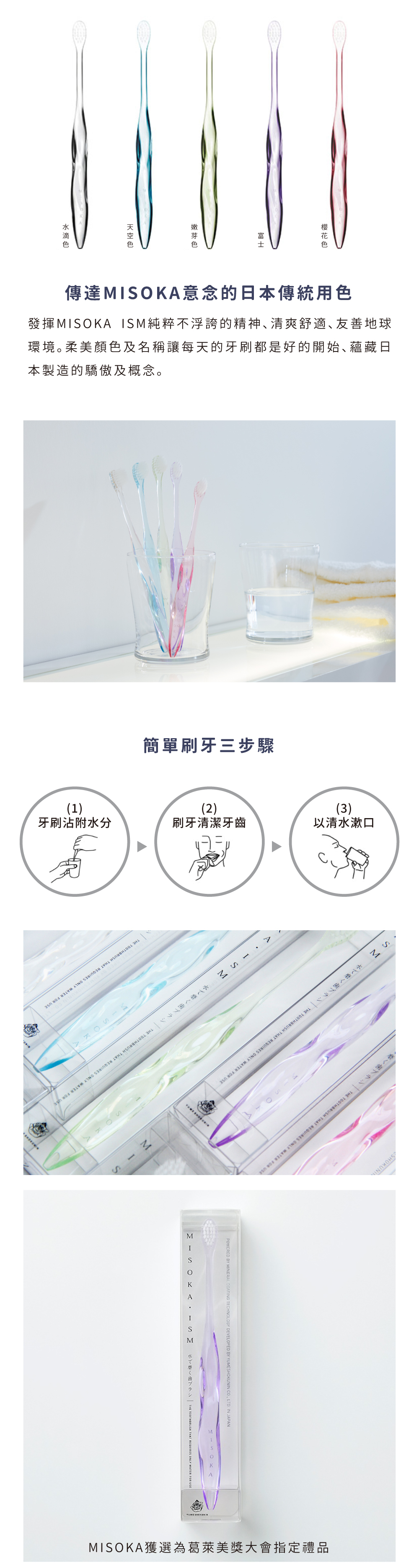 榮獲多項國際設計大獎 蘊藏MISOKA哲學的牙刷。哲學款以日本製造的精神、創造高品質的生活、保護地球環境,是集合MISOKA品牌哲學的代表作。外觀設計源自汲取流動的水,兼具美觀、好刷、好清洗等優點的技術結晶。