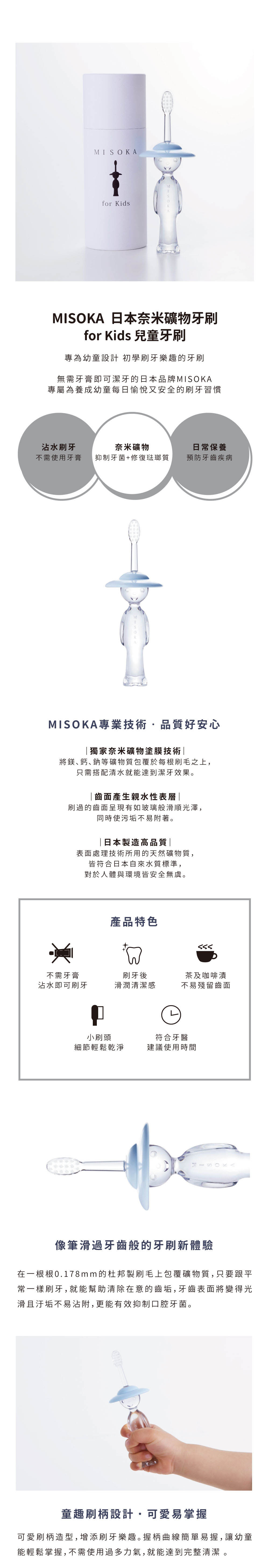 專為幼童設計,為養成幼童刷牙習慣,在初學刷牙時,能每日愉悅又安全的樂趣刷牙。for Kids 兒童牙刷的刷毛為MISOKA獨家奈米礦物塗膜技術,沾水即可刷牙,並有效抑制牙菌,促進琺瑯質再生的技術,成為幼童健康保養的日常工具。