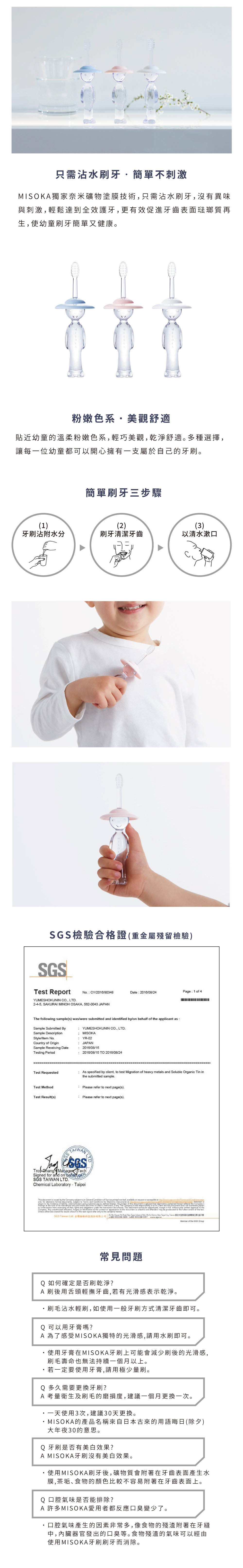 來自日本的 MISOKA,擁有獨家專利的奈米礦物塗膜技術,將天然礦物質均勻包覆於刷毛上,無需牙膏即可達到潔牙效果。所使用的礦物皆通過日本自來水質標準檢驗,對人體與環境皆無負擔,安全性無虞。