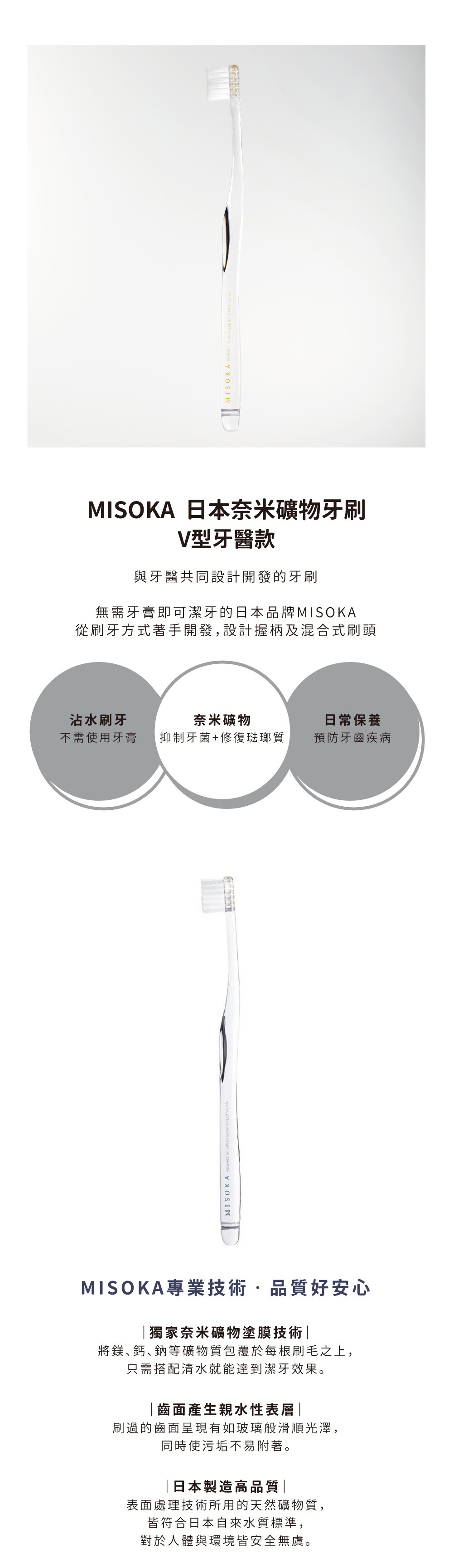 來自日本的 MISOKA,擁有獨家奈米礦物塗膜技術,將礦物質包覆於刷毛之上,只需搭配清水就能達到潔牙效果。這項表面處理技術所用的天然礦物質,皆符合日本自來水質標準,對於人體與環境皆安全無虞。也正因為搭配清水即可刷牙,在日常應用中比一般牙刷更加廣泛且彈性,上市至今已在日本及亞洲各國銷售超過 450 萬支,是打造劃時代頂級牙刷的領導品牌。