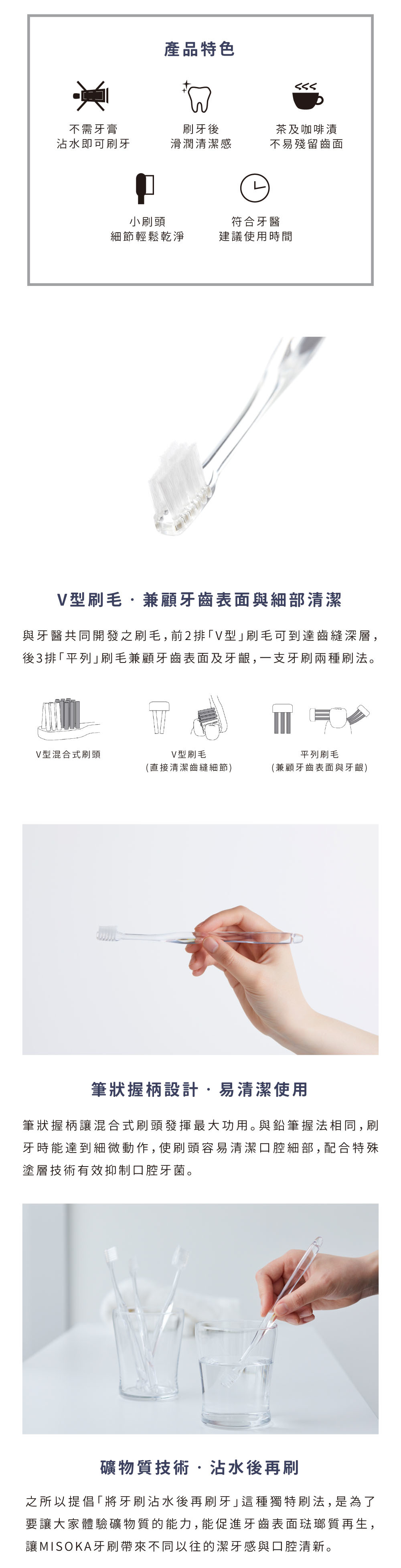 來自日本的 MISOKA,擁有獨家奈米礦物塗膜技術,將天然礦物質包覆於刷毛之上,只需清水即可達到潔牙效果,無需牙膏。該技術所使用的成分皆符合日本自來水質標準,對人體與環境皆安全無虞。由於免牙膏的特性,讓 MISOKA 在日常生活、旅遊、戶外等多場景中皆能靈活使用。