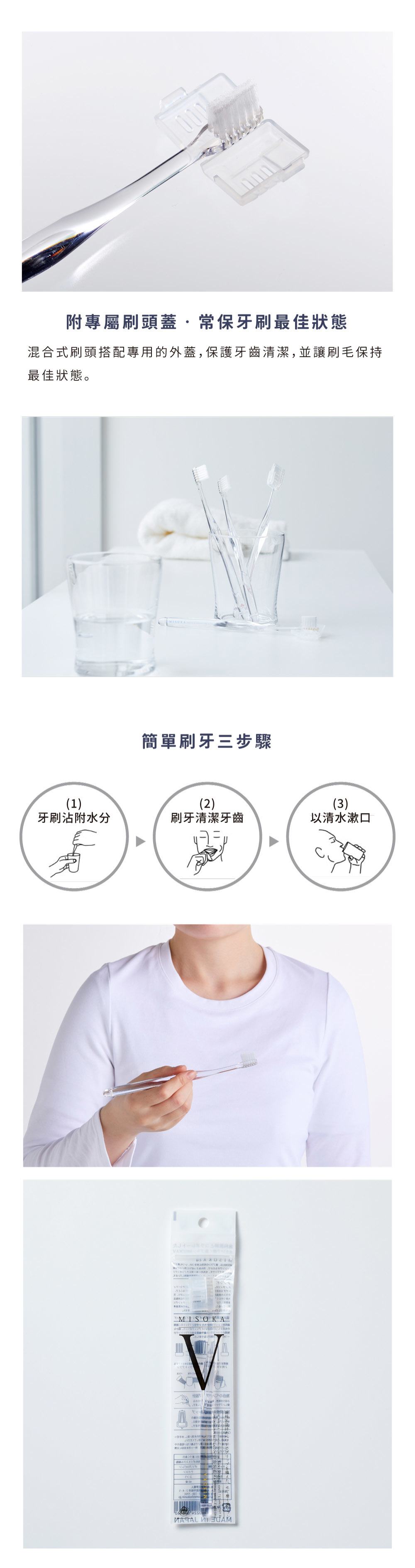 與牙醫共同開發之「V型」機能款,採複合式刷毛(前2排「V型」刷毛,後3排「平列」刷毛),兼顧牙齒表面與細部清潔。
