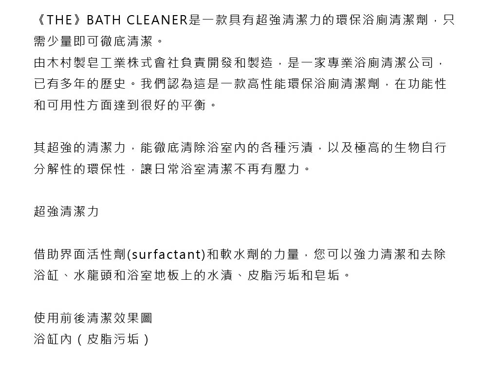 由木村製皂工業株式會社負責開發和製造,是一家專業浴廁清潔公司,已有多年的歷史。THE認為這是一款高性能環保浴廁清潔劑,在功能性和可用性方面達到很好的平衡。其超強的清潔力,能徹底清除浴室內的各種污漬,以及極高的生物自行分解性的環保性,讓日常浴室清潔不再有壓力。