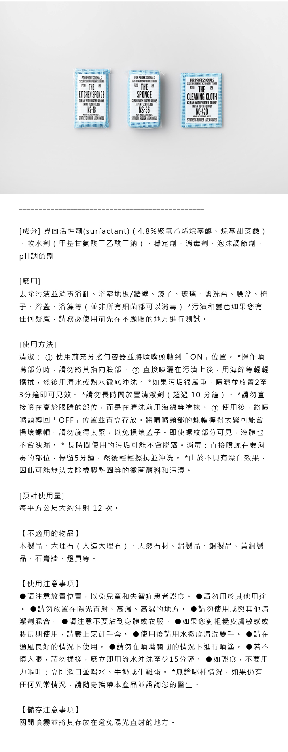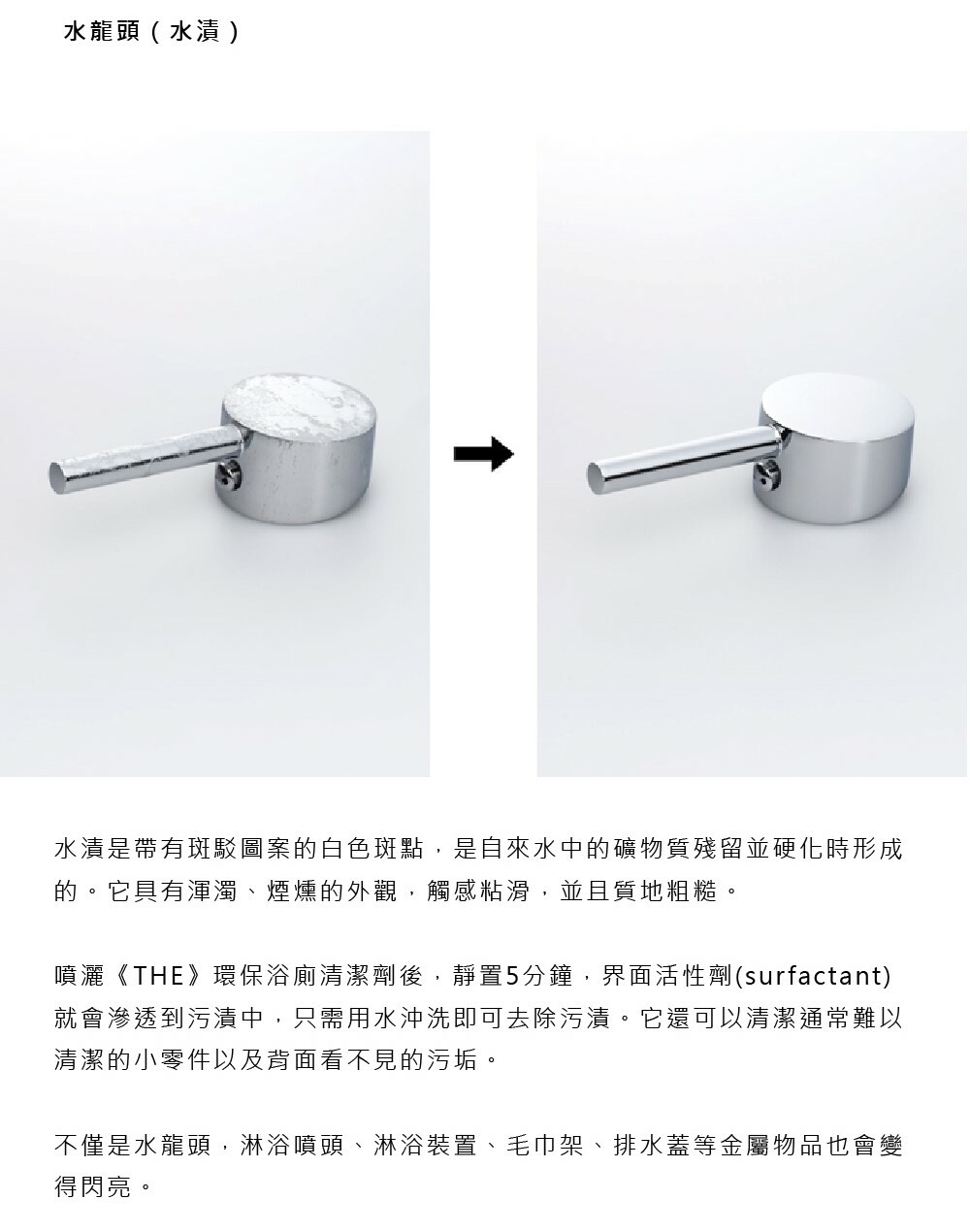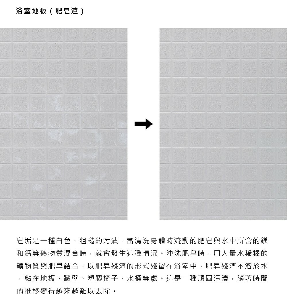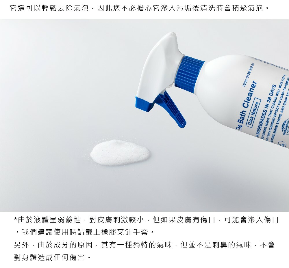 借助界面活性劑(surfactant)和軟水劑的力量,可以強力清潔和去除浴缸、水龍頭和浴室地板上的水漬、皮脂污垢和皂垢。不僅可以用在浴室,還可以用在洗手盆、廚房水槽、馬桶等。