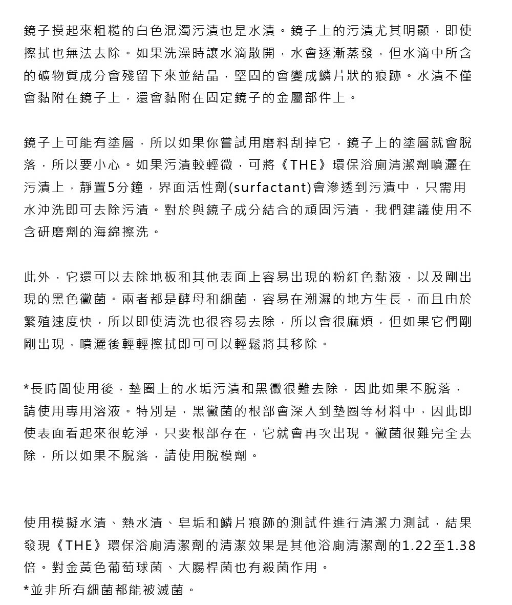 使用模擬水漬、熱水漬、皂垢和鱗片痕跡的測試件進行清潔力測試,結果發現《THE》環保浴廁清潔劑的清潔效果是其他浴廁清潔劑的1.22至1.38倍。對金黃色葡萄球菌、大腸桿菌也有殺菌作用。