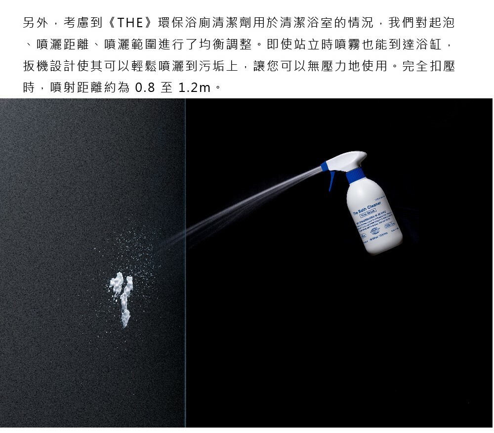考慮到《THE》環保浴廁清潔劑用於清潔浴室的情況,THE對起泡、噴灑距離、噴灑範圍進行了均衡調整。即使站立時噴霧也能到達浴缸,扳機設計使其可以輕鬆噴灑到污垢上,讓您可以無壓力地使用。完全扣壓時,噴射距離約為 0.8 至 1.2m。