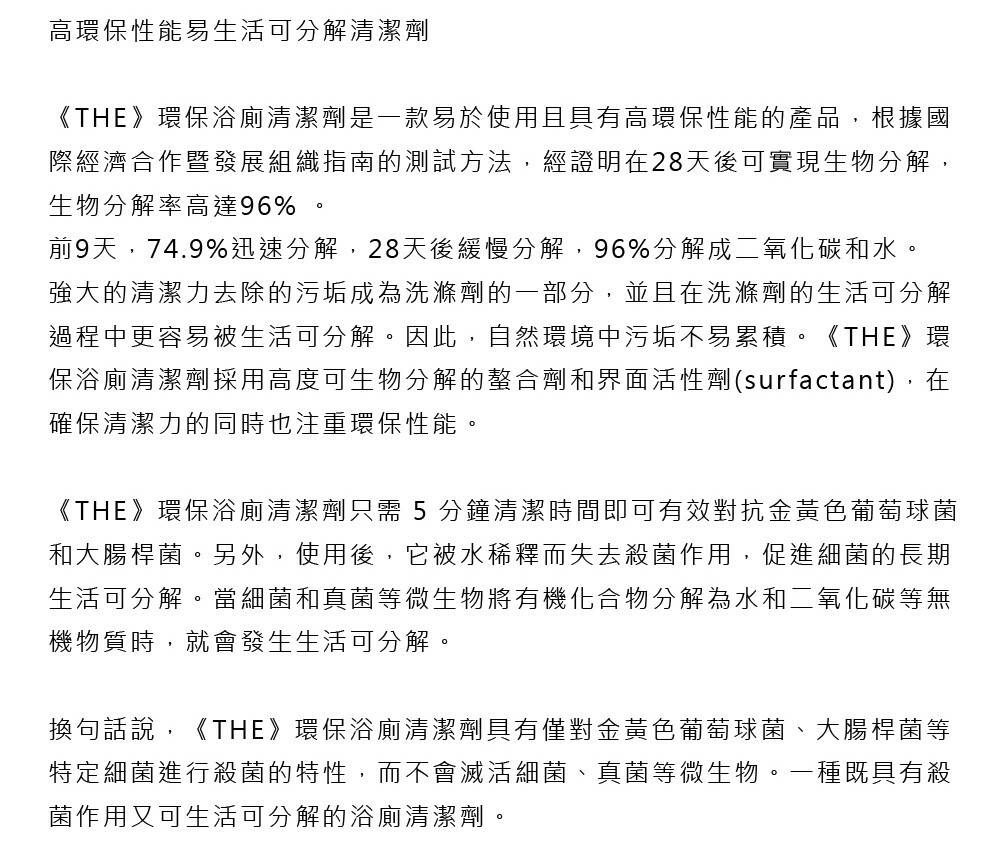 根據國際經濟合作暨發展組織指南的測試方法,經證明在28天後可實現生物分解,生物分解率高達96% 。前9天,74.9%迅速分解,28天後緩慢分解,96%分解成二氧化碳和水。自然環境中污垢不易累積。《THE》環保浴廁清潔劑採用高度可生物分解的螯合劑和界面活性劑(surfactant),在確保清潔力的同時也注重環保性能。