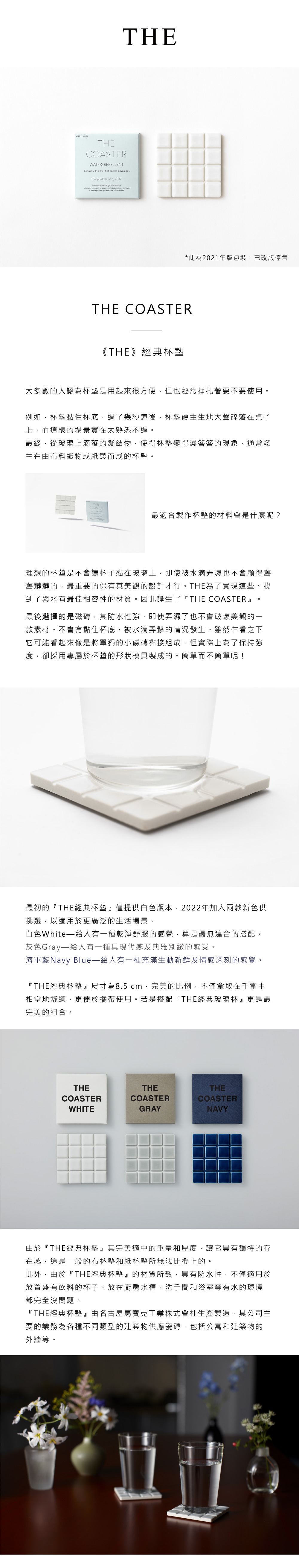 理想的杯墊是不會讓杯子黏在玻璃上,即使被水滴弄濕也不會顯得舊舊髒髒的,最重要的保有其美觀的設計才行。THE為了實現這些、找到了與水有最佳相容性的材質。因此誕生了『THE COASTER』。