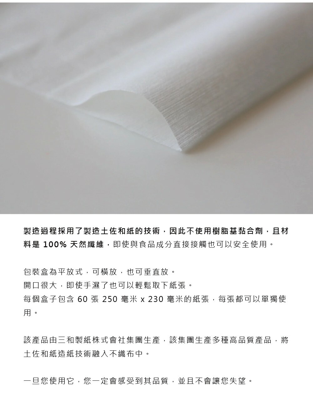 該產品由三和製紙株式會社集團生產,該集團生產多種高品質產品,將土佐和紙造紙技術融入不織布中。