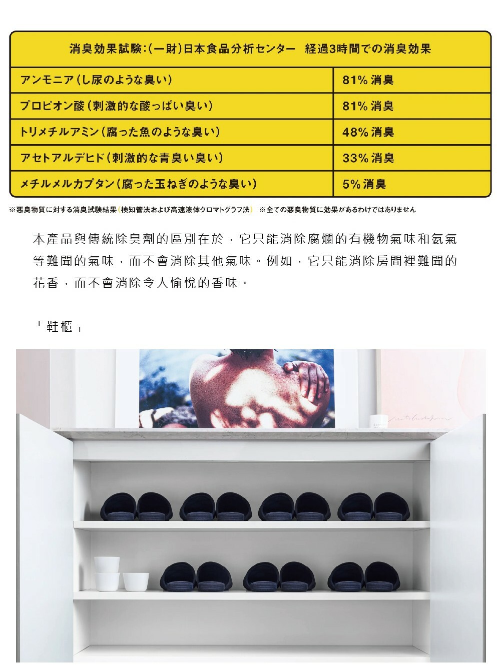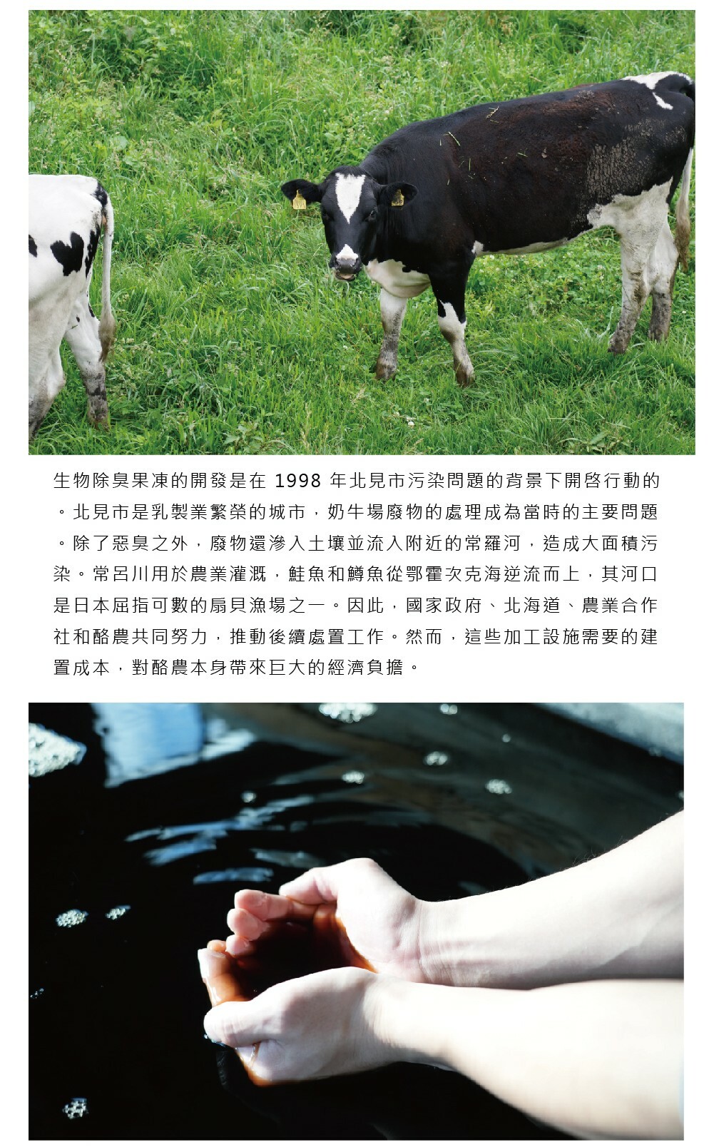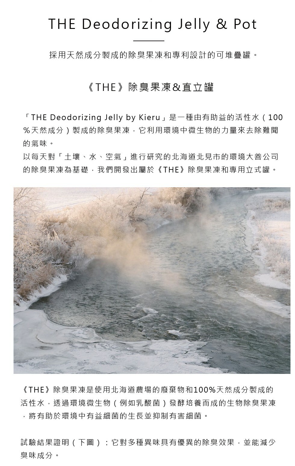 是一種由有助益的活性水(100%天然成分)製成的除臭果凍,它利用環境中微生物的力量來去除難聞的氣味。以每天對「土壤、水、空氣」進行研究的北海道北見市的環境大善公司的除臭果凍為基礎,開發出屬於《THE》除臭果凍和專用立式罐。