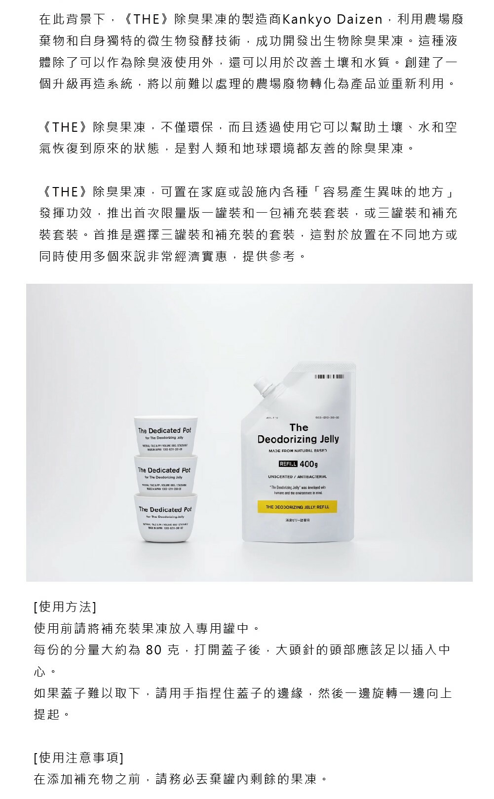 《THE》除臭果凍,不僅環保,而且透過使用它可以幫助土壤、水和空氣恢復到原來的狀態,是對人類和地球環境都友善的除臭果凍。