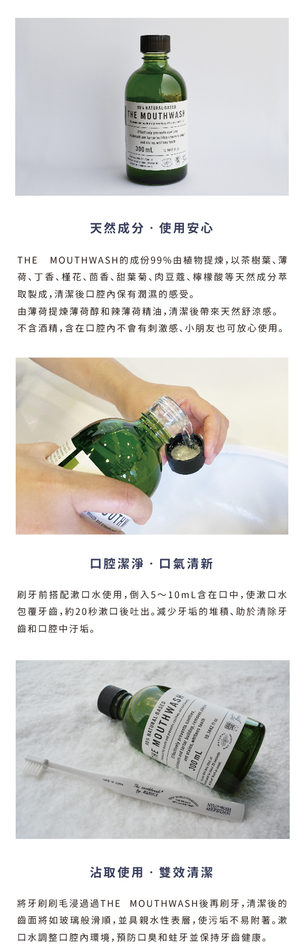 「THE MOUTHWASH」則是由THE與自然、有機化妝品公司—(株)F’s Beauty共同打造的聯名款商品。成份99%由植物提煉,清潔完後口腔保有濕潤與清涼的感受。