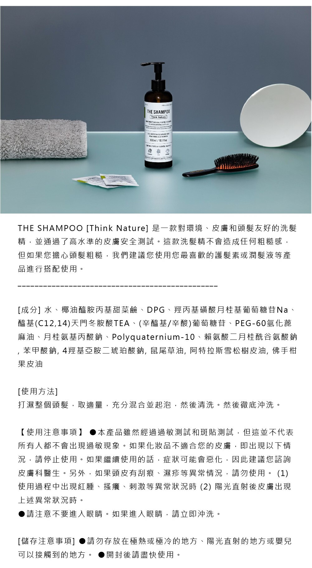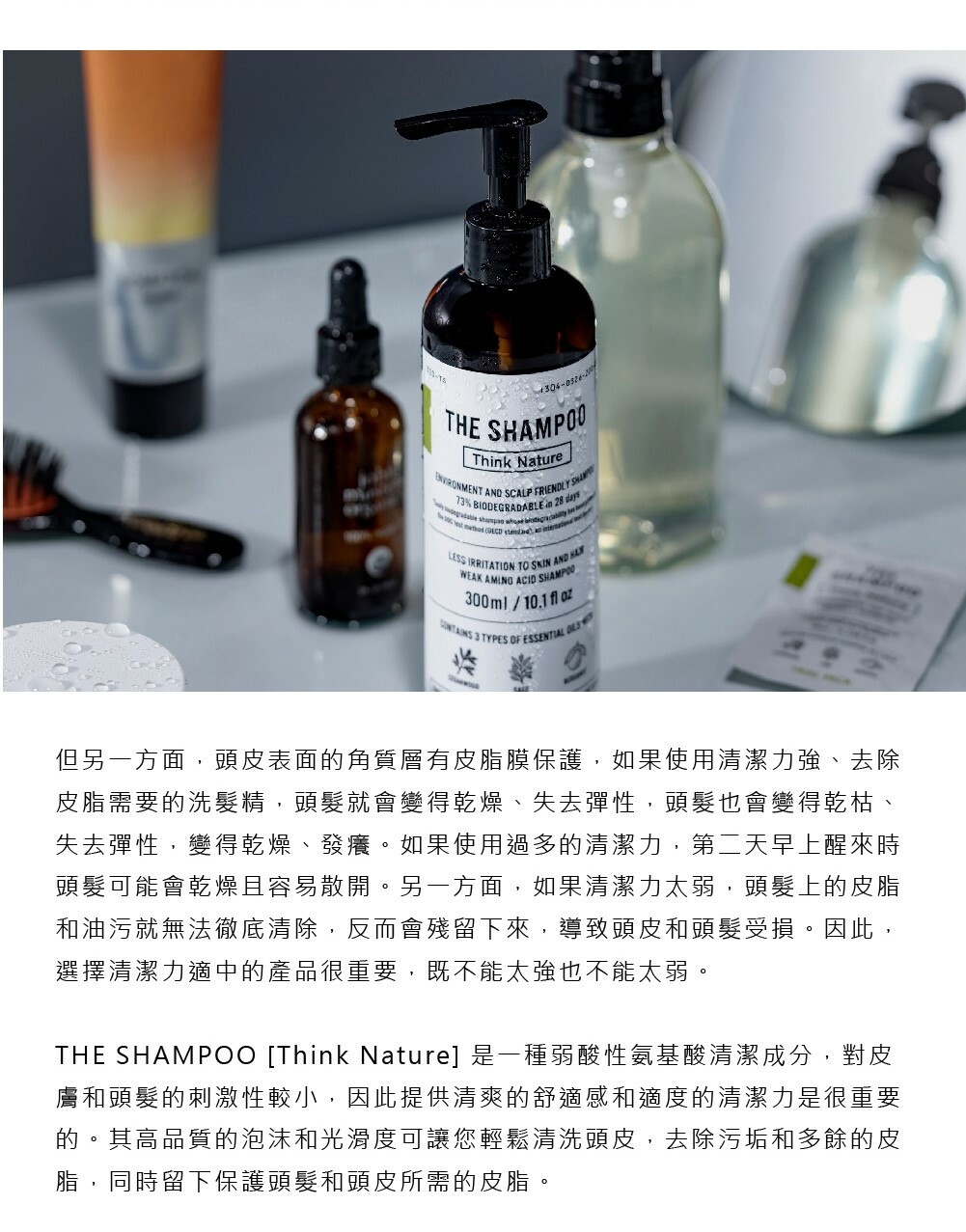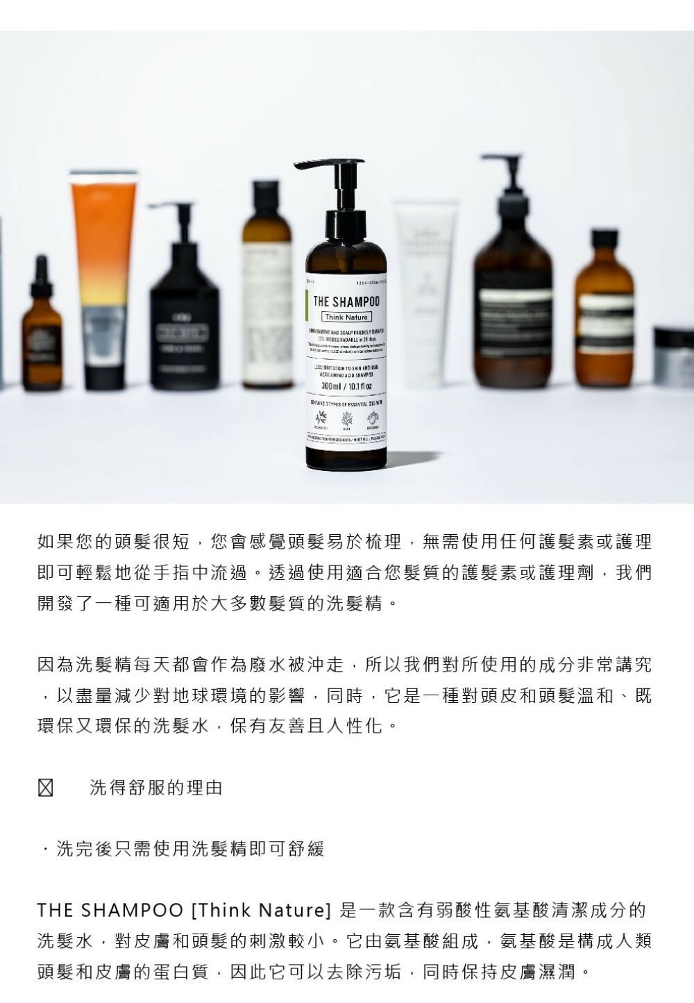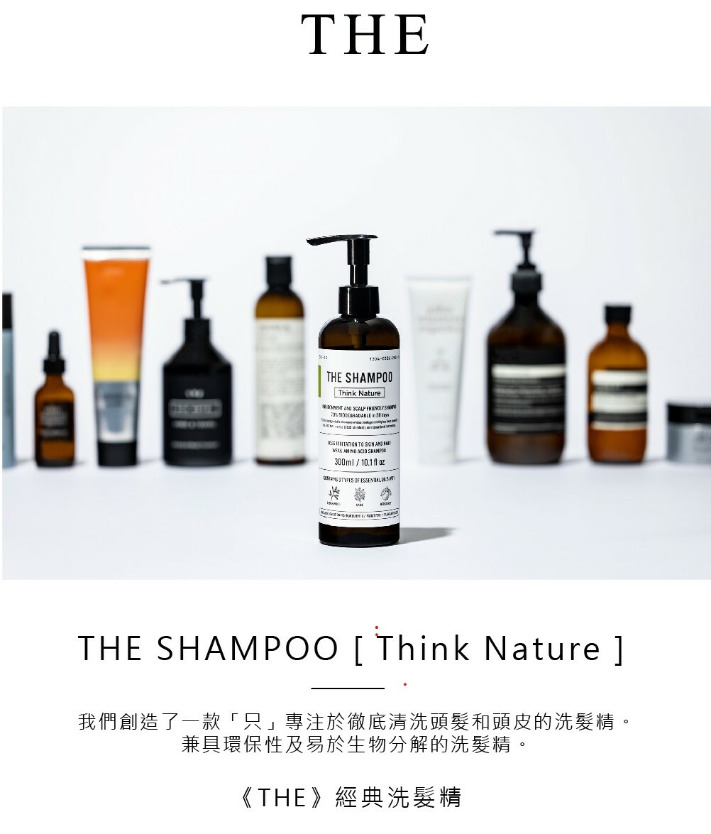 THE SHAMPOO [Think Nature] 是一款含有弱酸性氨基酸清潔成分的洗髮水,對皮膚和頭髮的刺激較小。它由氨基酸組成,氨基酸是構成人類頭髮和皮膚的蛋白質,因此它可以去除污垢,同時保持皮膚濕潤。