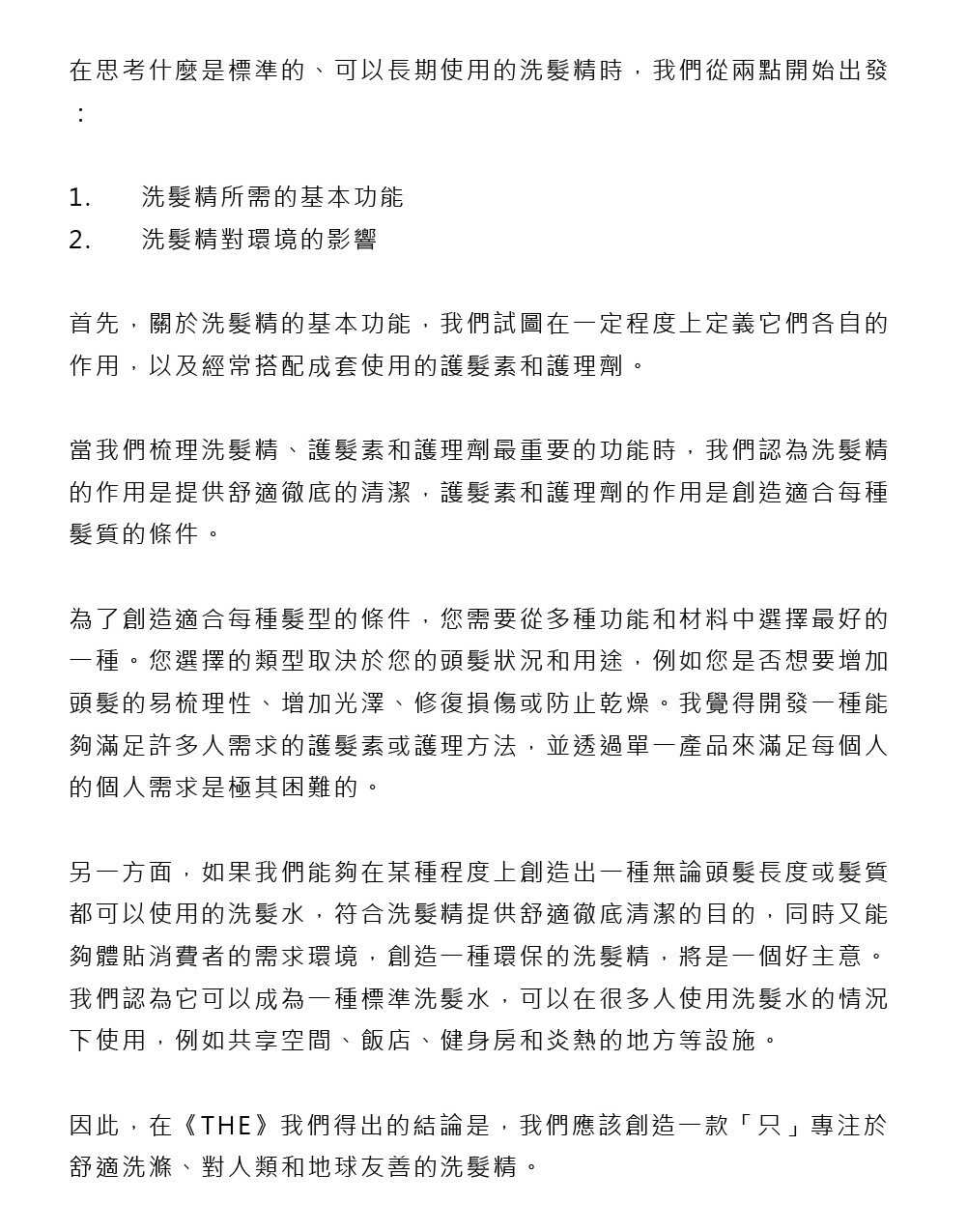 THE認為洗髮精的作用是提供舒適徹底的清潔,護髮素和護理劑的作用是創造適合每種髮質的條件,因此THE專注於創造出一種無論頭髮長度或髮質都可以使用的洗髮精,以符合舒適且徹底清潔的目的。