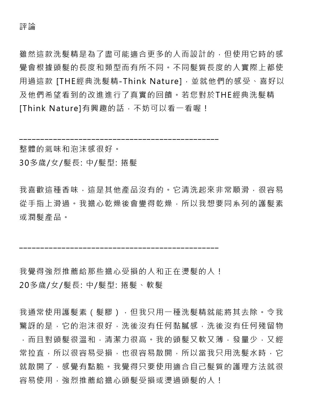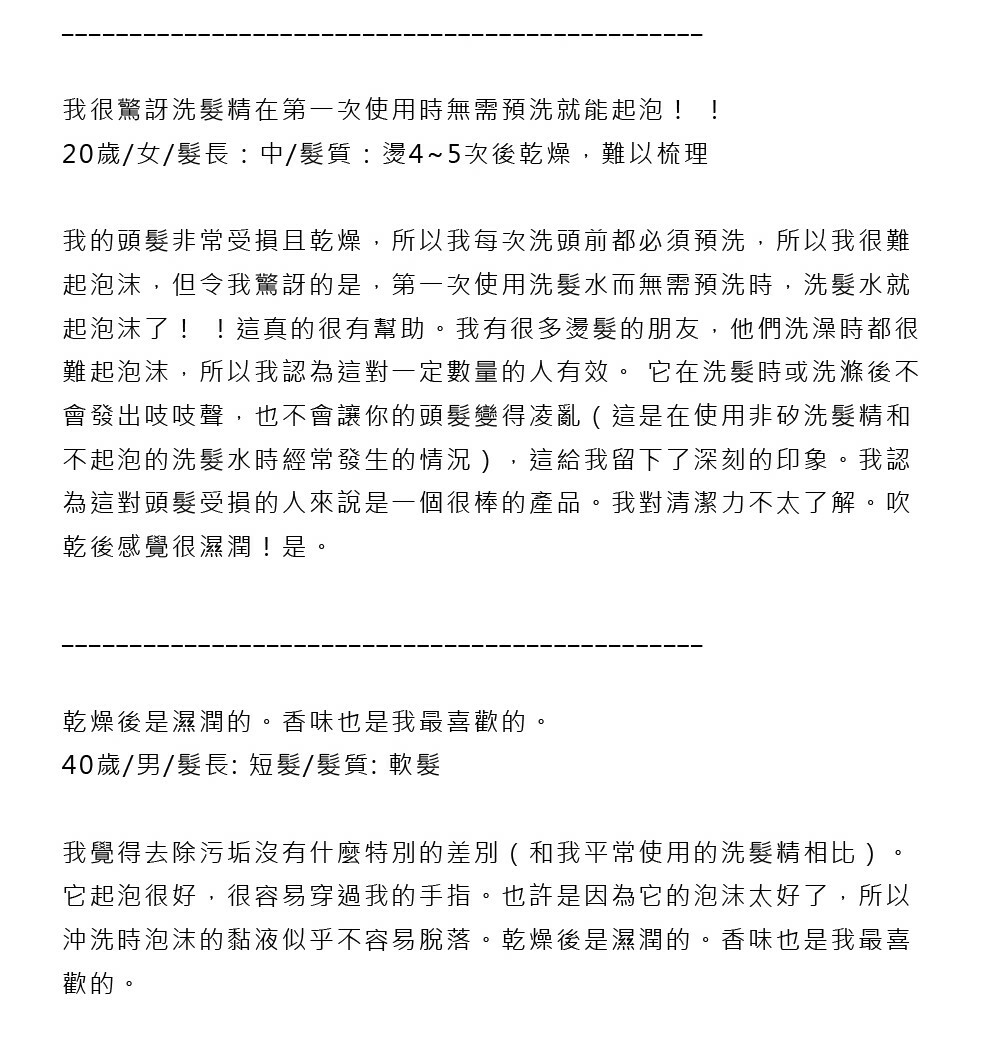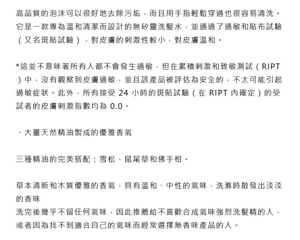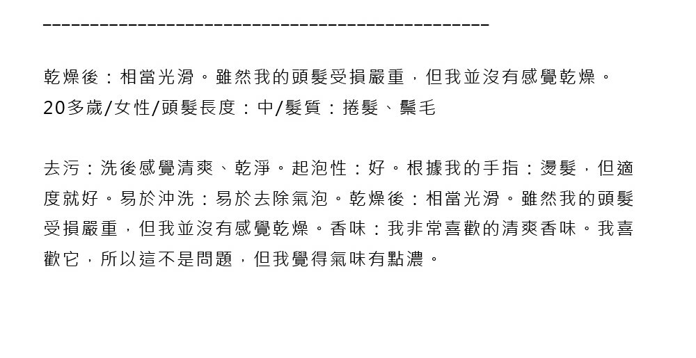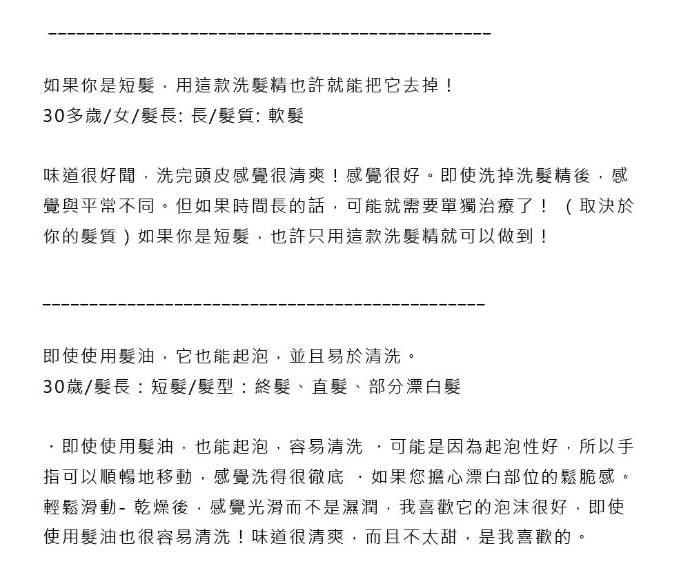洗完後幾乎不留任何氣味,因此推薦給不喜歡合成氣味強烈洗髮精的人。