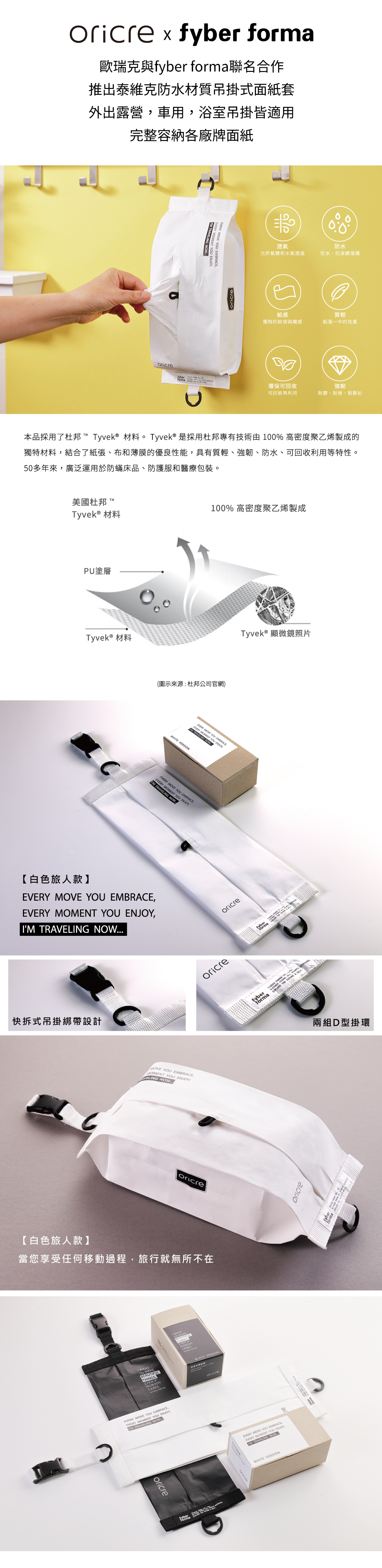 與fyber forma聯名合作,推出泰維克防水材質吊掛式面紙套。外出露營,車用,浴室吊掛皆適用,完整容納各廠牌面紙。