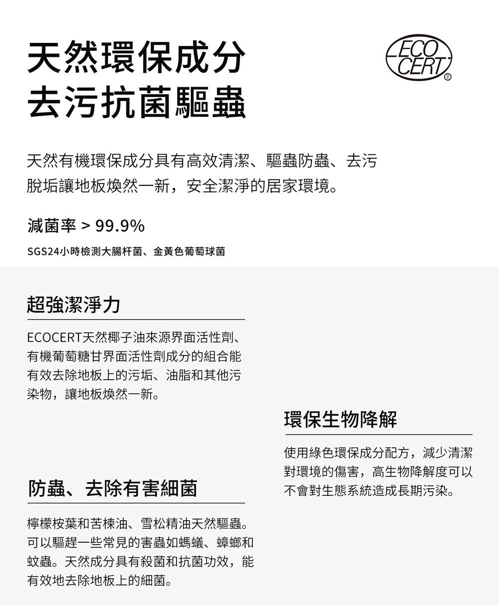 具有天然驅蟲功能抑菌去污的地板清潔,小孩寵物友善,讓居家環境更安心,清除細菌和過敏原,