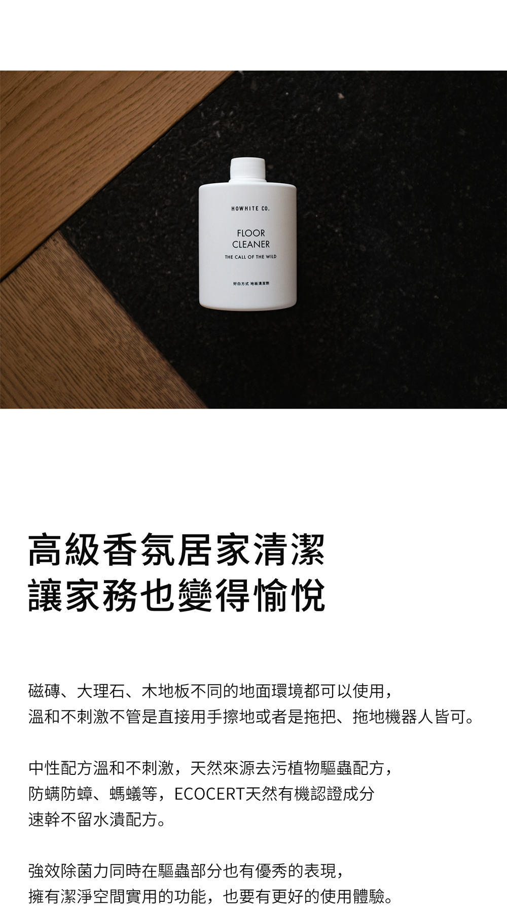 磁磚、大理石、木地板不同的地面環境都可以使用,溫和不刺激不管是直接用手擦地或者是拖把、拖地機器人皆可。