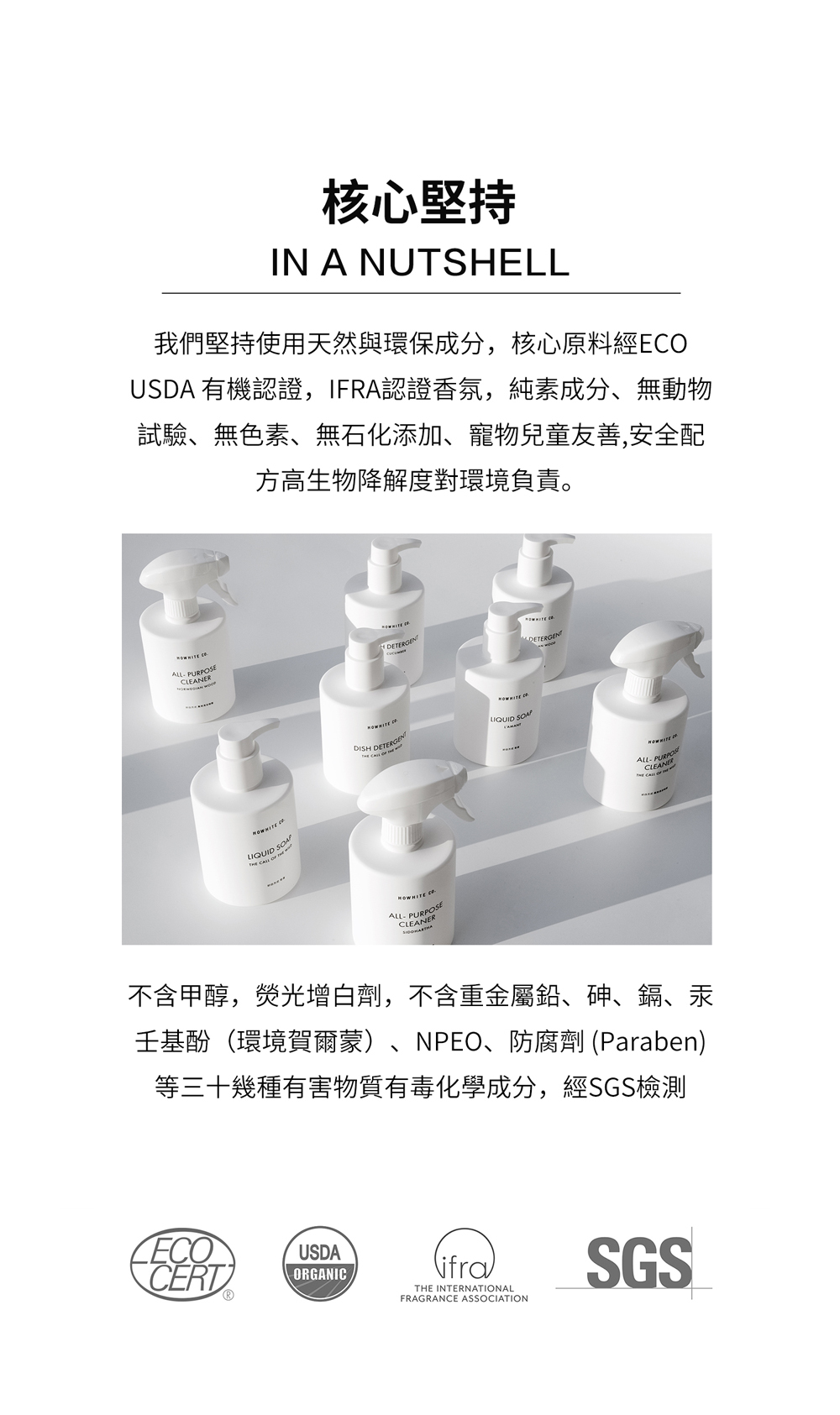 歐盟認證永續種植有機植物萃取成分,無毒無害天然降解,不會對家人環境造成汙染和傷害,家裡有小孩老人寵物也不用擔心,全家人都能安心使用。
